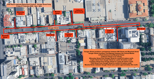 Gouger Street Party Proposed Temporary Road Closures - From 3pm to 9pm on Friday 27 February 2026, the following roads are proposed to be closed: