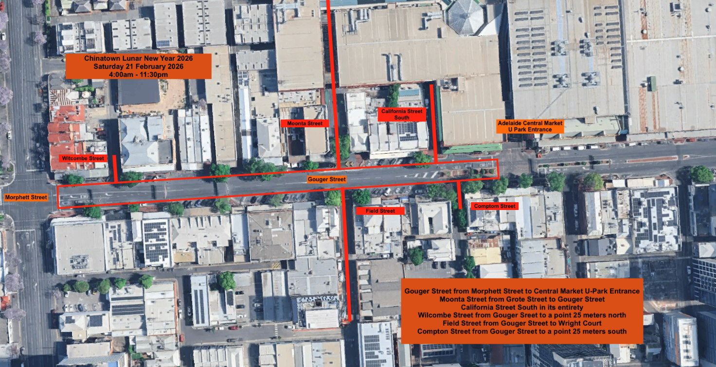 We are asking for feedback on proposed road closures for two events planned for 2026: Chinatown Adelaide Lunar New Year, and the Repco Adelaide Motorsport Festival Peak Hour of Power and Gouger Street Party.